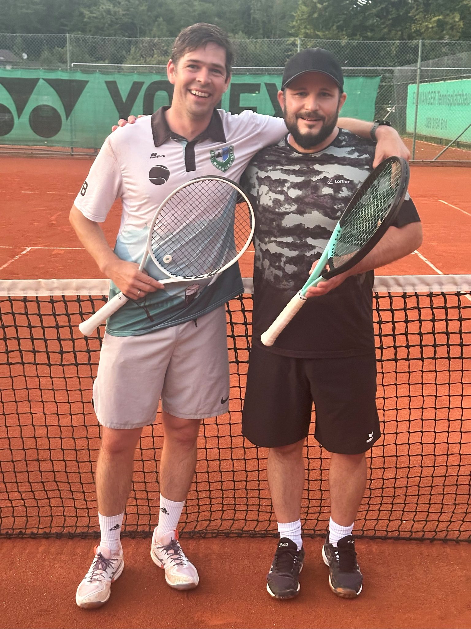 Bild Links: Rudi Sauer (rechts) gewann gegen Johannes Bauer ein knappes Finale und wurde erstmals Clubmeister bei den Herren. // Bild Mitte: Die Herren 40 konnte ihr Finale noch vor dem Regen beenden. Es siegte Heinz Hammerschmid vor Claus Hammerschmid und Frank Ruhbaum. // Bild Rechts: Klara Wagner siegte bei den Juniorinnen vor Caro Kindler und Aurelia Hammerschmid.